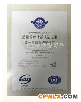 证书介绍 正峰车辆配件厂拥有完整、科学的质量管理体系,品质体现我们的尊严,出类拔萃的品质拒绝平庸。一丝不苟,千锤百炼,标准化的管理体系和系统化的品质保证体系让“正峰”品质在世界的每个角落都畅通无阻。“正峰”通过与合作者们卓有成效的努力,正促使“正峰”成为世界上最无可挑剔的品质。